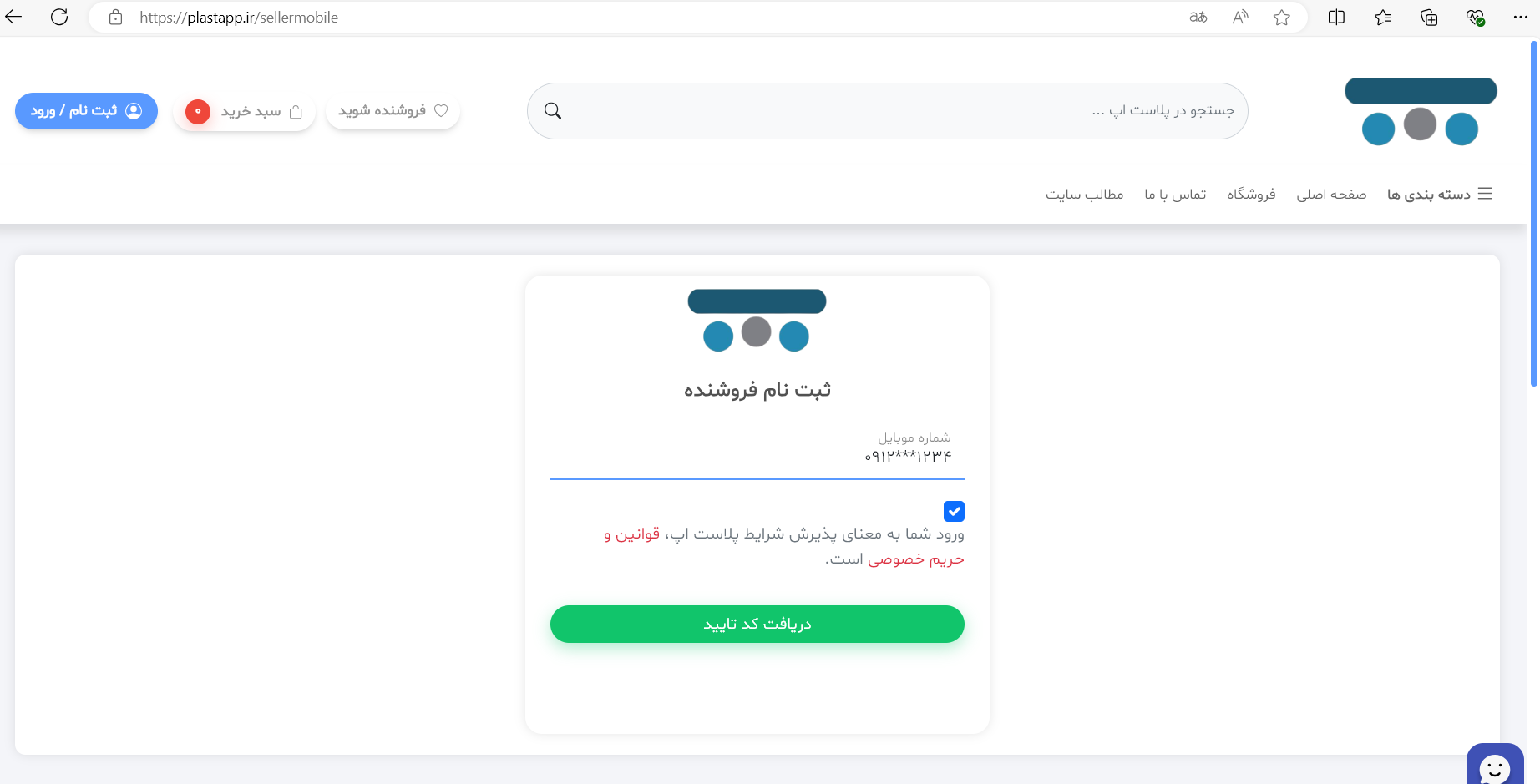 1-ابتدا بر روی گزینه فرشنده شوید در سایت و یا بر روی لینک plastapp.ir/sellermobile کلیک کنید.