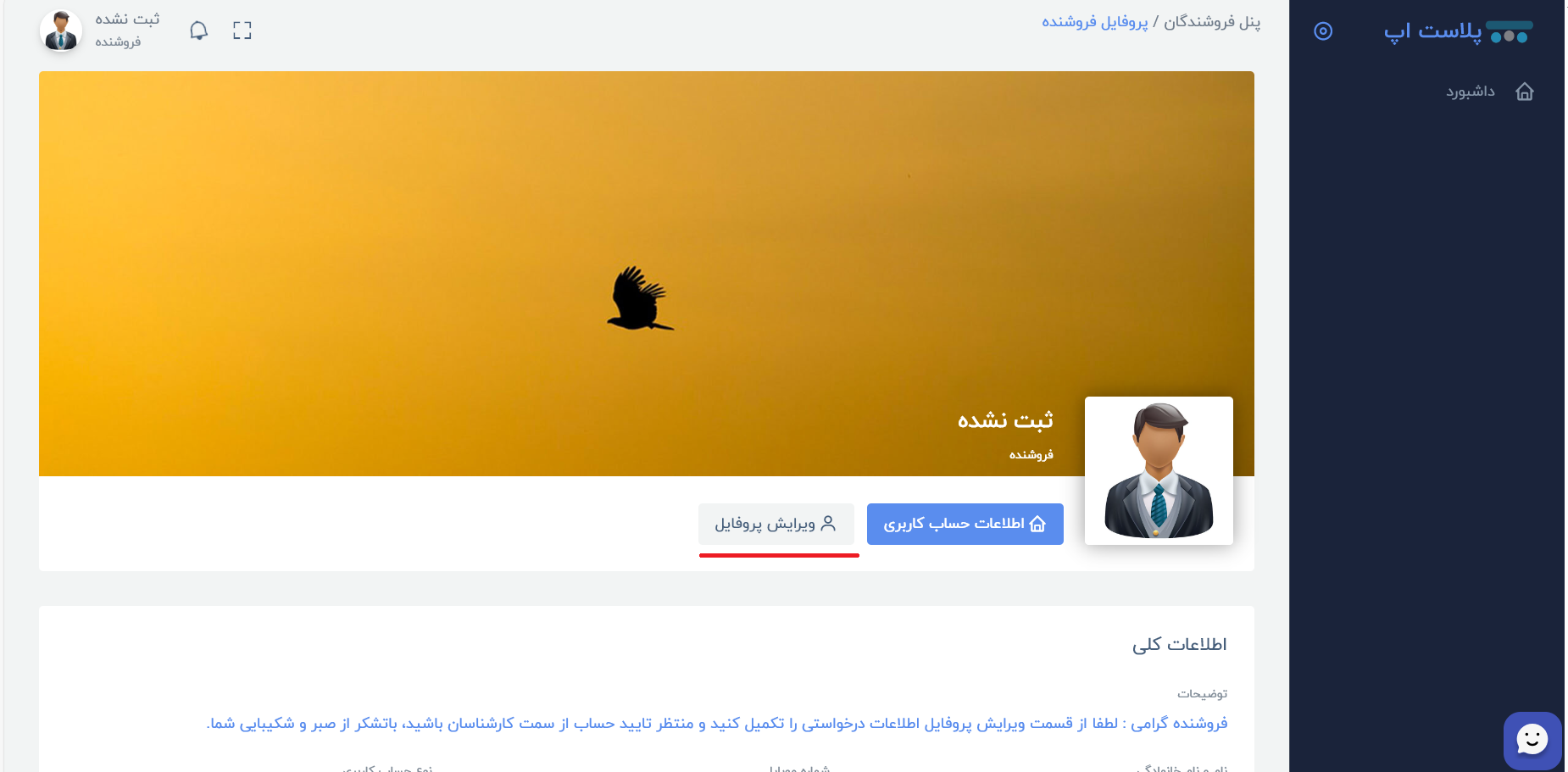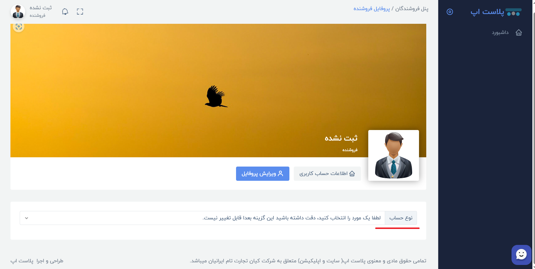 4-در صفحه جدید روی گزینه ویرایش پروفایل کلیک کرده و نسبت به تکمیل اطلاعات خواسته شده اقدام نمایید. ابتدا باید نوع حساب کاربری خود را انتخاب نمایید. در اینجا ما سه نوع حساب کاربری داریم. فروشنده حقیقی – فروشنده حقوقی – سایت فروشگاهی ( سایت فروشگاهی برای کاربرانی می باشد که یک سایت فروشگاهی فعال در این حوزه دارند).