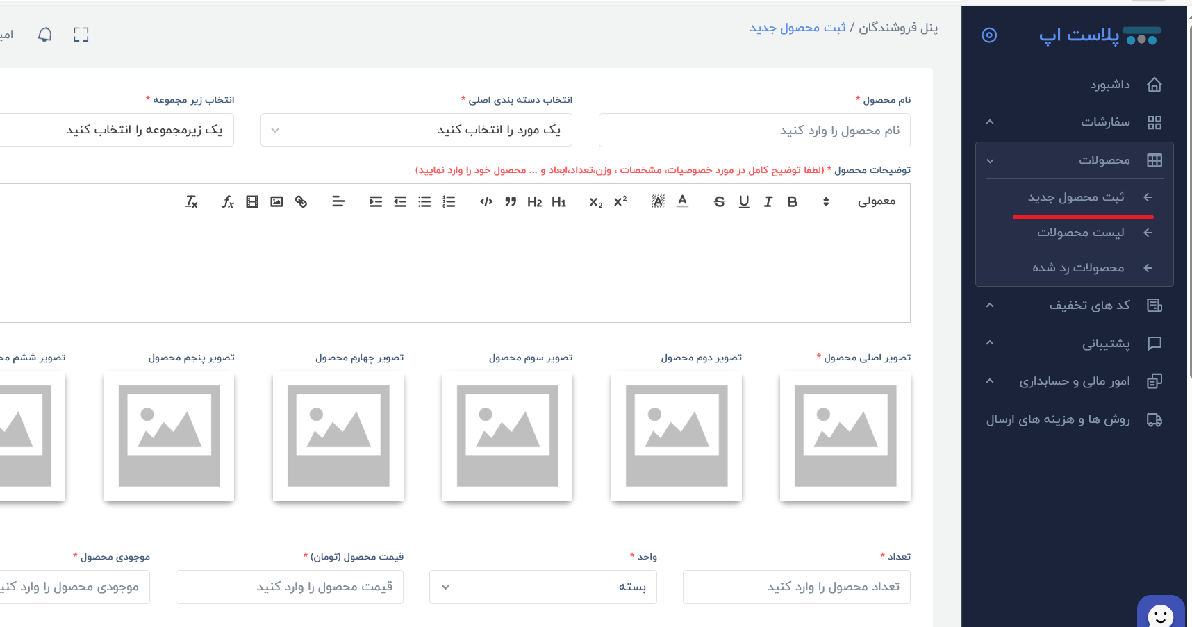 7-پس از تکمیل هزینه ها و روش های ارسال شما قادر به ثبت محصول از منوی محصولات خواهید بود.
